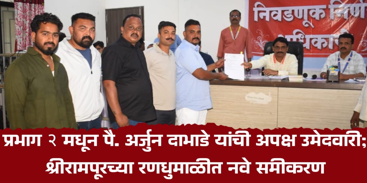 श्रीरामपूर (प्रतिनिधी) – श्रीरामपूर नगरपालिका निवडणुकीच्या पार्श्वभूमीवर प्रभाग क्रमांक २ मध्ये मोठी राजकीय घडामोड घडली असून, स्थानिक पातळीवर कार्यकर्त्यांचा भक्कम आधार असलेले पै. अर्जुन दाभाडे यांनी अपक्ष उमेदवार म्हणून अर्ज दाखल केला आहे. त्यांच्या या निर्णयाने प्रभागातील लढत अधिक चुरशीची होणार असून, अनेक पक्षांच्या गणितात बदल घडवून आणणार असल्याचे राजकीय जाणकारांचे मत आहे.