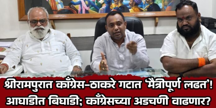 श्रीरामपूर (प्रतिनिधी ) :- आगामी नगर परिषद निवडणुकीसाठी श्रीरामपूरमध्ये महाविकास आघाडीतील घटक पक्षांमध्ये मोठी राजकीय उलथापालथ झाली आहे. काँग्रेस आणि शिवसेना उद्धव बाळासाहेब ठाकरे गटात अखेर ‘मैत्रीपूर्ण लढत’ होणार असल्याचे निश्चित झाले आहे. या निर्णयामुळे श्रीरामपूर शहर आणि तालुक्यात राजकीय वातावरण तापले असून, काँग्रेसच्या स्थानिक नेतृत्वाच्या अडचणीत वाढ होण्याची शक्यता वर्तवली जात आहे. शिवसेना ठाकरे गटाचे जिल्हाध्यक्ष सचिन कोते यांनी आज श्रीरामपूर येथे पत्रकार परिषदेत याबाबत अधिकृत माहिती दिली. स्थानिक काँग्रेस आमदार हेमंत ओगले, माजी उपनगराध्यक्ष करण ससाणे आणि जिल्हाध्यक्ष सचिन कोते, तालुकाध्यक्ष लखन भगत, जेष्ठ नेते अशोक थोरे यांच्यात झालेल्या बैठकीनंतर हा महत्त्वपूर्ण निर्णय घेण्यात आला आहे. ज्यात शिवसेना ठाकरे गटाने निवडणुकीत पूर्ण ताकदीने उतरण्याची तयारी केली आहे.
