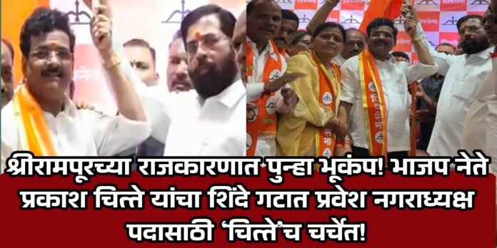 श्रीरामपूर (प्रतिनिधी): श्रीरामपूरच्या स्थानिक राजकारणात पुन्हा एकदा मोठा भूकंप झाल्याचे चित्र दिसू लागले आहे. भारतीय जनता पक्षातील प्रभावशाली आणि हिंदुत्ववादी विचारसरणीचे ज्येष्ठ नेते प्रकाश चित्ते यांनी आपल्या शेकडो कार्यकर्त्यांसह मुख्यमंत्री एकनाथ शिंदे यांच्या नेतृत्वाखालील शिवसेना (शिंदे गट) मध्ये प्रवेश केला आहे. या प्रवेशामुळे श्रीरामपूर नगरपालिका निवडणुकीचे संपूर्ण राजकीय समीकरण बदलण्याची शक्यता व्यक्त होत आहे.