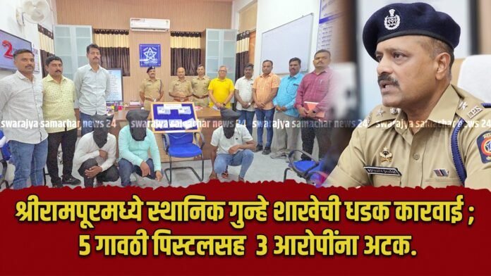 श्रीरामपूर/प्रतिनिधी :- शहरात मागील आठवड्यात भरदिवसा घडलेल्या गावठी कट्ट्याच्या थरारानंतर पोलीस प्रशासनाने आपली कठोर भूमिका स्पष्ट केली आहे. श्रीरामपूरातील वाढत असलेल्या गुन्हेगारीला लक्षात घेत, पोलीस अधीक्षक सोमनाथ घार्गे यांच्या आदेशानुसार, स्थानिक गुन्हे शाखेने तात्काळ ॲक्शन मोडवर येत श्रीरामपूर येथील हरेगाव फाटा उड्डाणपुलाजवळ सापळा रचून मोठी कारवाई केली. या धडाकेबाज मोहिमेत ५ गावठी पिस्टल आणि ९ जिवंत काडतुसांसह ३ आरोपींना जेरबंद करण्यात आले आहे. पोलिसांच्या या कारवाईतून अवैध अग्नीशस्त्रे बाळगणाऱ्या गुन्हेगारांवर कठोर कारवाई करण्याचा निर्धार पोलिसांनी व्यक्त केला आहे.