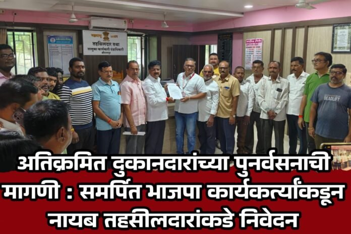 श्रीरामपूर (प्रतिनिधी) : जानेवारी–फेब्रुवारी महिन्यात राबवण्यात आलेल्या प्रलयंकारी अतिक्रमण मोहिमेमुळे श्रीरामपूर शहरातील अंदाजे दोन ते सव्वा दोन हजार दुकाने जमीनदोस्त झाली. या कारवाईमुळे हजारो कुटुंबांचा प्रपंच रस्त्यावर आला असून त्यांचा उदरनिर्वाह पूर्णपणे ठप्प झाला आहे. या दुकानदारांचे तात्काळ पुनर्वसन व्हावे, यासाठी समर्पित भारतीय जनता पार्टीच्या कार्यकर्त्यांनी तहसील कचेरीत नायब तहसीलदार श्री. शिंदे यांना निवेदन दिले. दुकानदारांना पूर्वी ज्या ठिकाणी दुकाने होती त्याच ठिकाणी किमान पाच बाय पाच फुटांच्या गाळ्यांच्या स्वरूपात पुनर्वसन करण्यात यावे, अशी मागणी निवेदनात करण्यात आली.