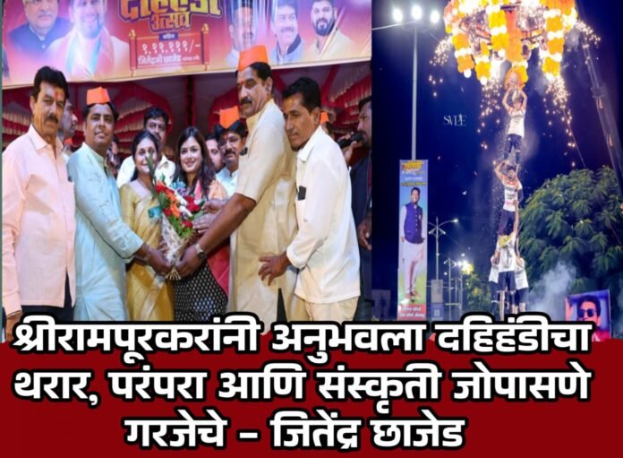 श्रीरामपूर : युवानेते खा. सुजय विखे पाटील यांच्या संकल्पनेतून आणि मार्गदर्शनाखाली, गोविंदा रे गोपाळाचा जयघोष, डीजेच्या आवाजात मंगलमय गजर, गोविंदाच्या संगीतावर थिरकणार्या तरुणाईचा उसळलेला जनसागर अशा उत्साही वातावरणात श्रीरामपूर शहर भारतीय जनता पार्टी व श्रीराम तरुण मंडळ आयोजित दहीहंडीचा थरार श्रीरामपूरकरांनी अनुभवला. मेनरोड वरील श्रीराम मंदिर चौकात तुडुंब गर्दीसमोर शंभुराजे ग्रुपने सहा थर रचत ही दहीहंडी फोडण्याचा बहुमान मिळवला.